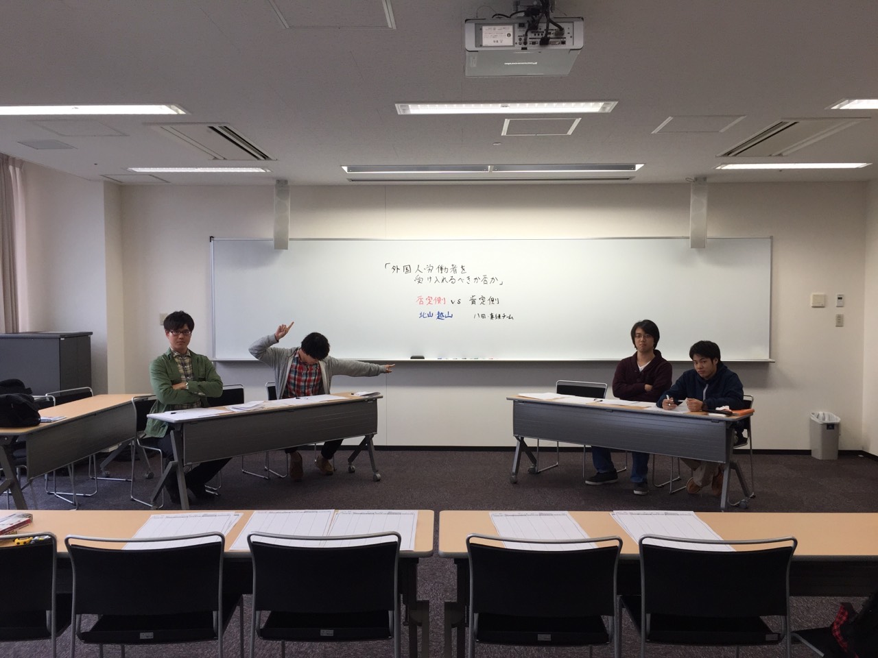 4回生の方々と永松先生にジャッジしてもらい、肯定側(ちゃんコンビ)が2対1で勝ちましたー