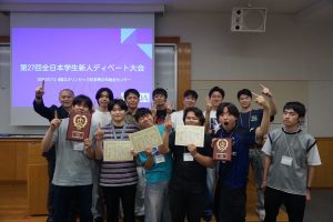 ディベートを始めて約4か月がたち、とうとう第27回全国学生新人ディベート大会当日を迎えました。はじめのころは、ロジックやエビデンスの少ない立論でディベートの難しさを痛感していた我々ですが、永松教授の手厚い指導の下、レベルを向上させてきました。